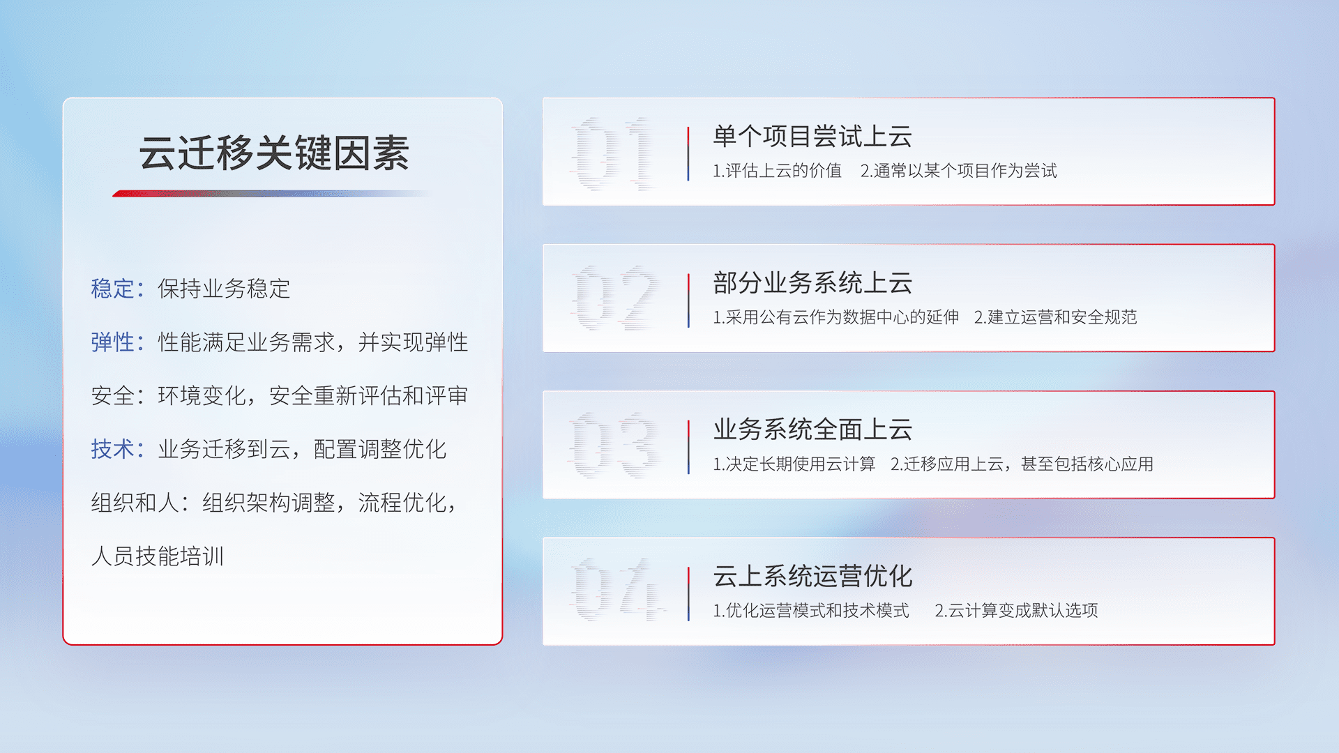 结合实际业务,,从规划设计、、、云平台选型、、、、云原生改造、、、数据迁移、、集成交付,,,,迁移全过程为客户识别最佳上云路径,,,,做好风险识别管理,,,设计网络架构、、、、身份权限、、安全审计合规、、操作审计、、、日志审计、、、监控告警策略、、多站点容灾设计等,,,,对云上基础设施进行整体规划,,,提升IT治理水平,,以满足弹性、、高可用、、、、高性能的需求。。。。