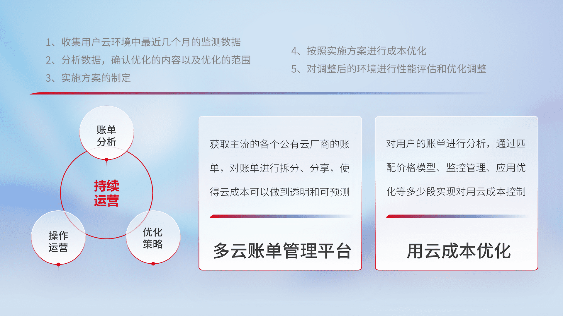 通过多云纳管,,,以统一的资源数据模型把客户的云资源进行抽象和封装,,进而实现对多云资源的统一操作,,,保障云资源管理的可靠性、、、稳定性与可用性。。。量身定制化运维内容,,,,配置、、、、开发运维、、、补丁管理、、、、备份、、监控、、认证和访问管理、、、、审计和日常巡检等,,,,保障在用云过程中的可靠度,,稳定度以及高可用率。。。